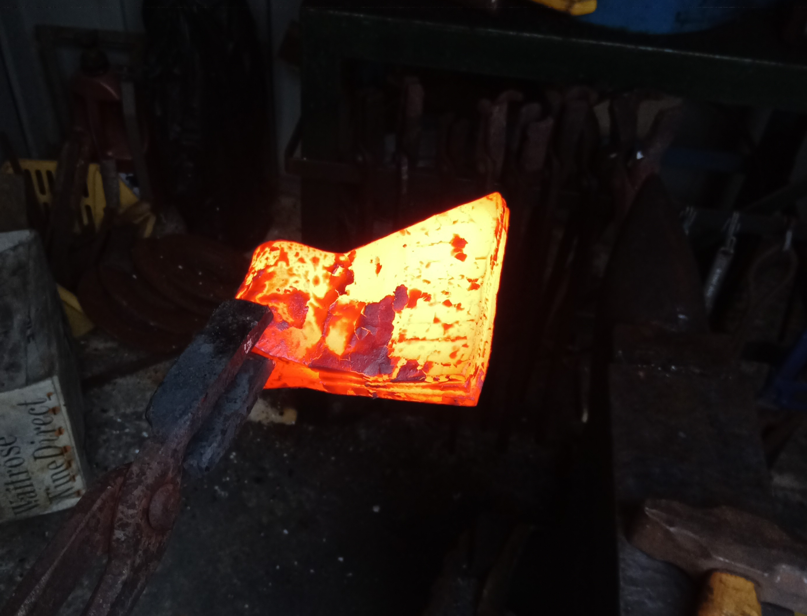 Here the forged head is being tried onto the handle. You can see how much the steel spreads as it is welded, care is taken to ensure it only spreads away from the handle and downwards as the blade would look odd spreading upwards above the rest of the head: