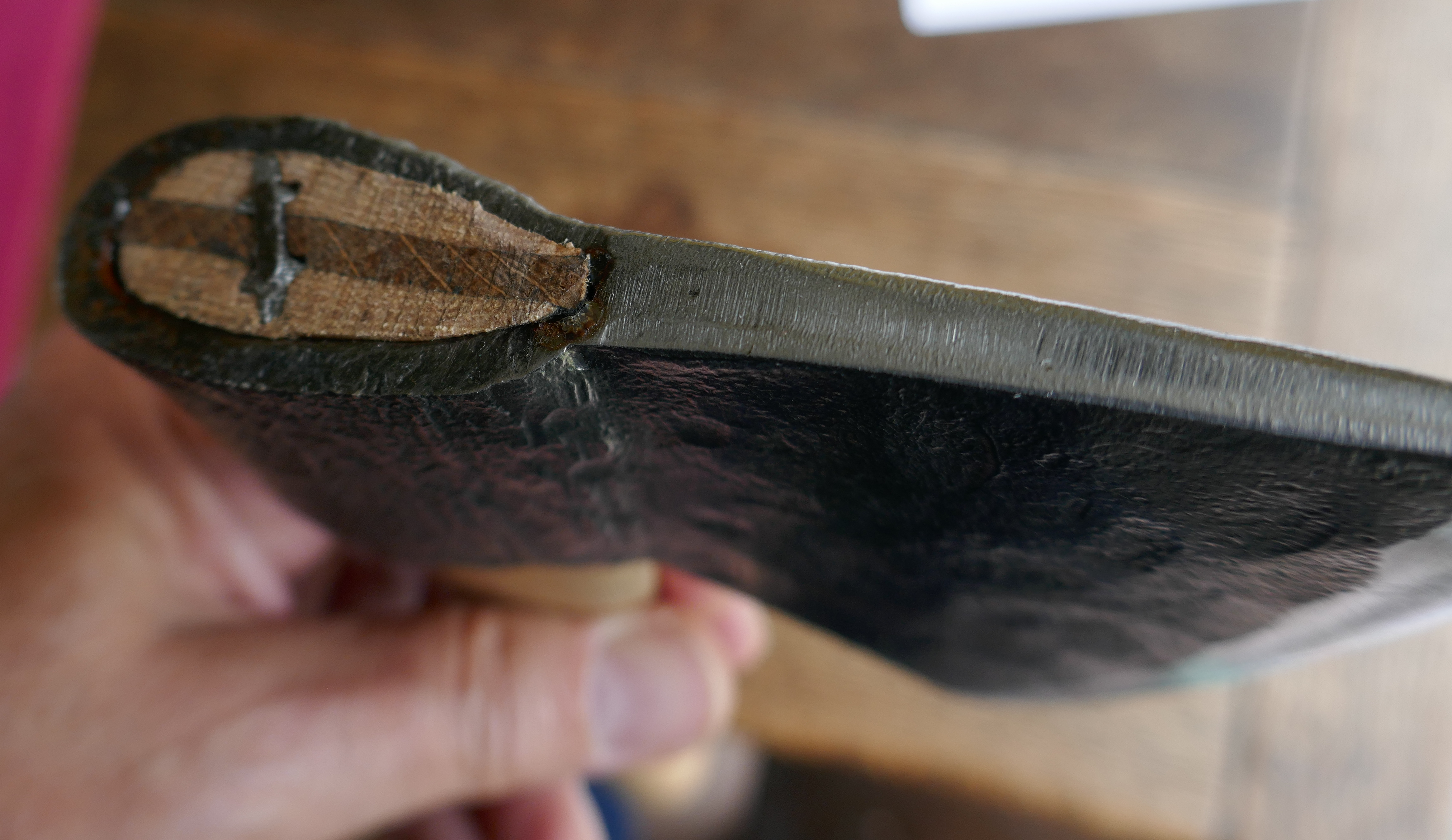 Here the wedge is being inserted into the slot in the handle. It is worth measuring the amount of space that needs to be filled so the wedge can be cut to the right thickness: