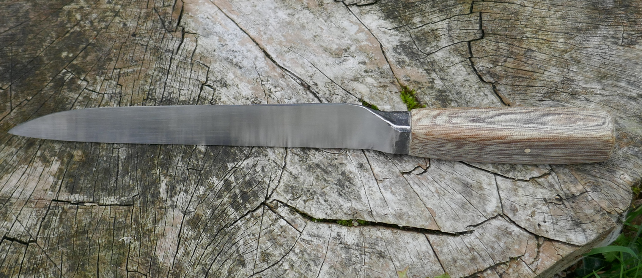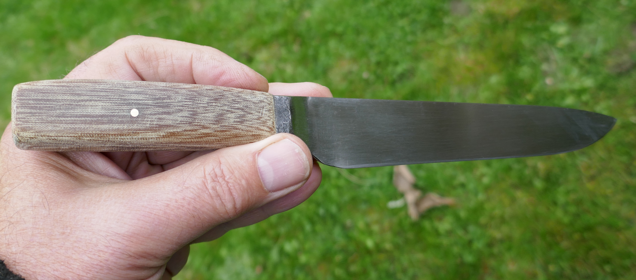 It had been a while since I had forged anything, so I fired up the forge and used a piece of car spring to make this knife. I used tufnol for the handle as it will be far more resistant to washing up than wood is.